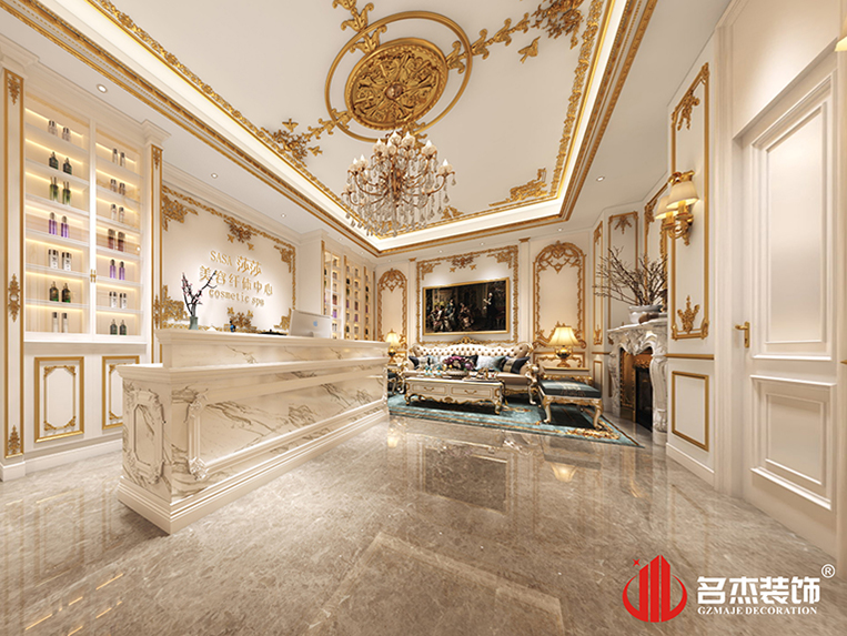 在整體的設計當中,設計團隊以現代奢華的風格來作為這次的主打風格,以金色作為改纖體中心的點綴色,而且不同造型上使用的顏色也是金色,讓空間充滿這一種奢華的感覺。在燈具的使用上也是按照奢華的路線走,水晶吊頂,壁燈,營造出優雅、富麗的氛圍。#美容裝修設計#