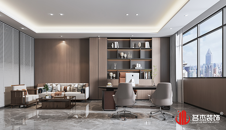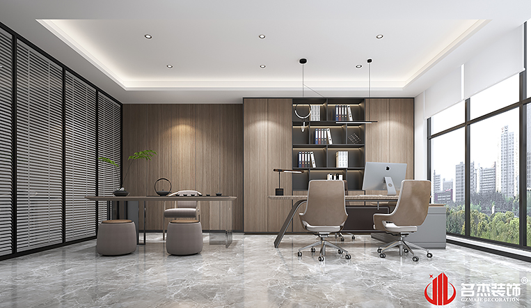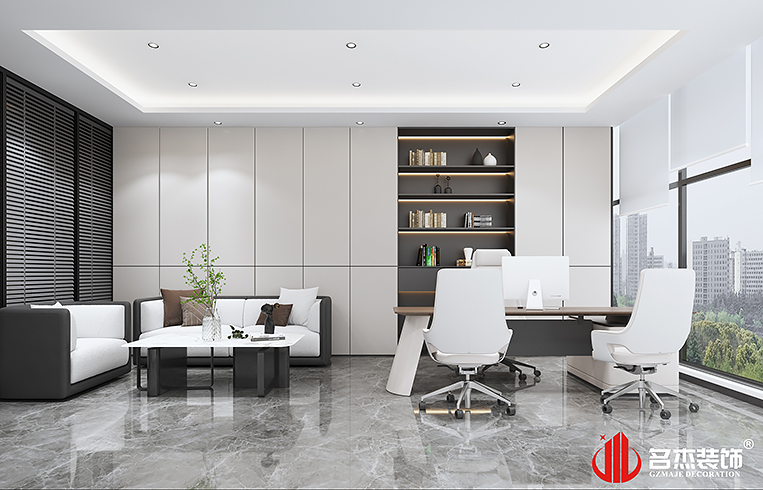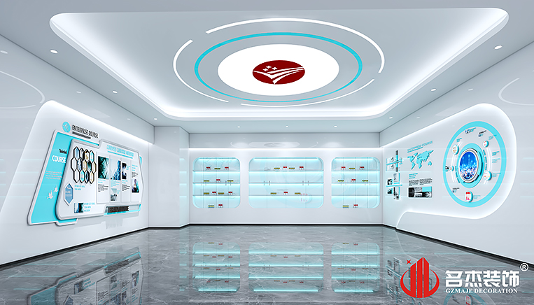 藍色作為企業標志色,設計師將它大量地運用在辦公室裝修設計空間中,不同明度的灰色與科技藍進行組合,提升了空間的層次感,營造出清透干凈的質感。天花弧形造型作為空間的點睛之筆,同時也是將空間的設計層次拔高到另一個層次。
