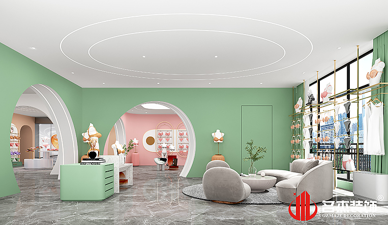 在前臺區(qū)域使用線條和弧形元素來增加空間的設(shè)計(jì)層次感,同時(shí)在整體設(shè)計(jì)當(dāng)中加入了莫蘭迪色系作為點(diǎn)綴元素,讓空間的設(shè)計(jì)層次感再次得到提升。不同子品牌采用的是不同的顏色,這樣容易讓大眾更好的識別,同時(shí)賦予子品牌不一樣的活力,再加上不同于常規(guī)造型的門,突出想要做出別樣的裝修設(shè)計(jì)風(fēng)格。