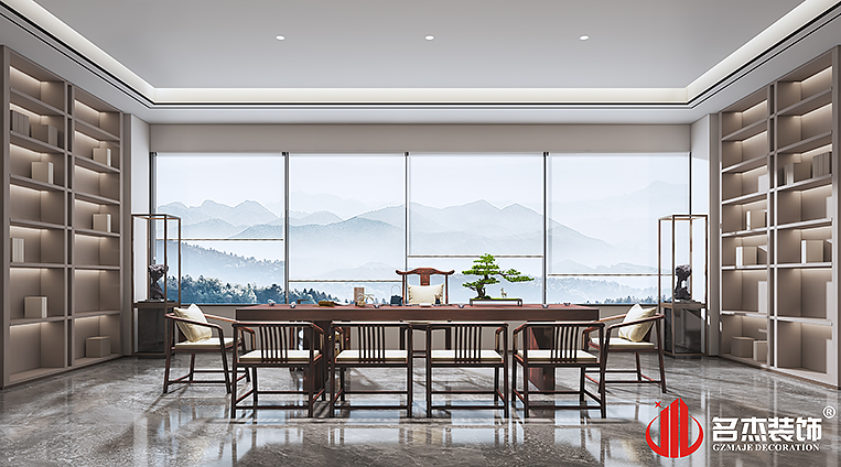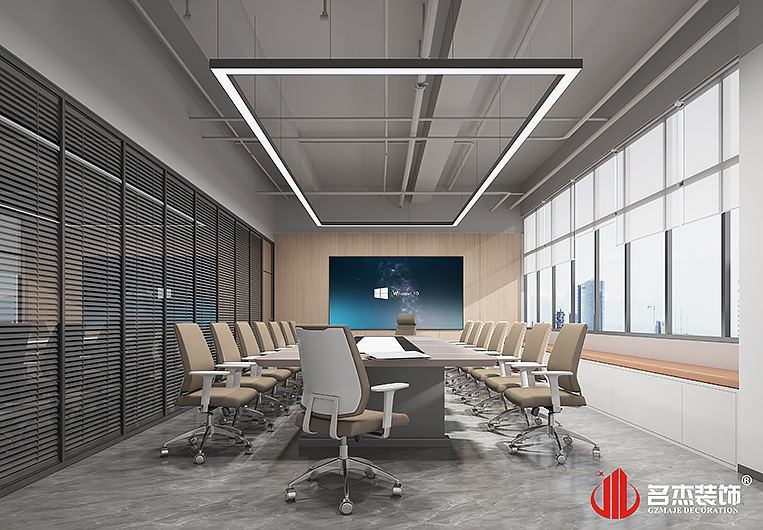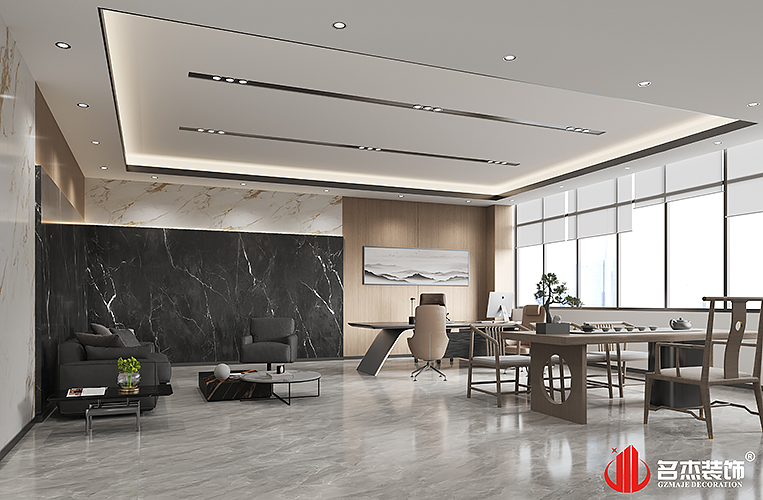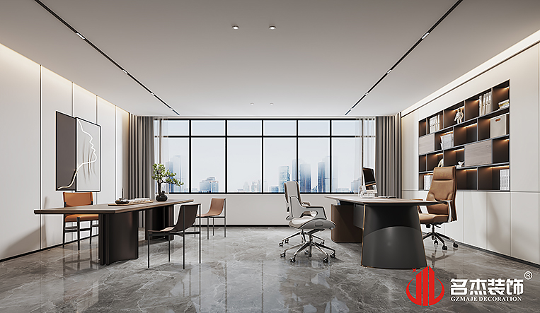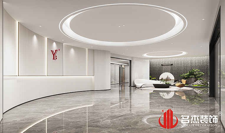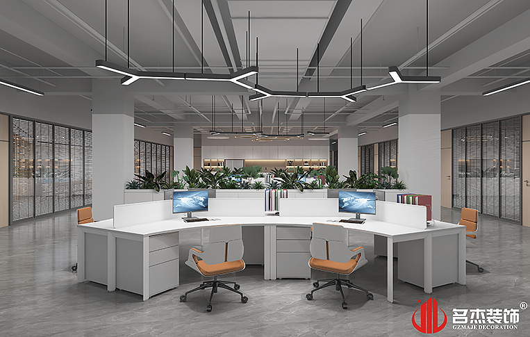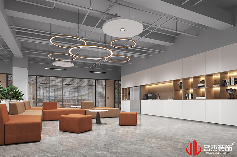 整體辦公裝修設計空間是以黑白灰作為主色調的,同時使用暖色系的燈光來營造出一種溫馨的氛圍,讓空間看起來更加有層次感。使用圓弧形吊頂則是為空間增添不少的設計感,以及不規則的燈具的加入,讓整體辦公裝修設計空間變得更加有時尚感。