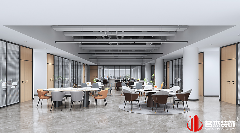 前廳是整個辦公裝修設計空間的一大亮點,前臺背景墻大理石條紋的拼接組合打破了原本傳統的設計,大理石紋路與燈飾的配合,碰撞出了不一樣的火花,加上嵌入燈帶的配合,使整個空間充滿靈動。圓形吊頂也能夠讓空間煥發出不一樣的設計層次感,兩者相互配合,共同打造出一個特別的辦公場景。