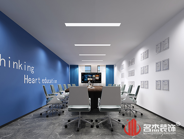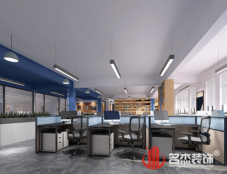 整體的辦公區域加入了藍色色調作為跳色的設計元素,也與企業LOGO的顏色相互呼應。部分區域也采用了弧形元素來增加整體的設計感,讓整個辦公室裝修設計更加具有時尚感。