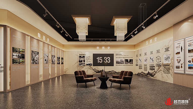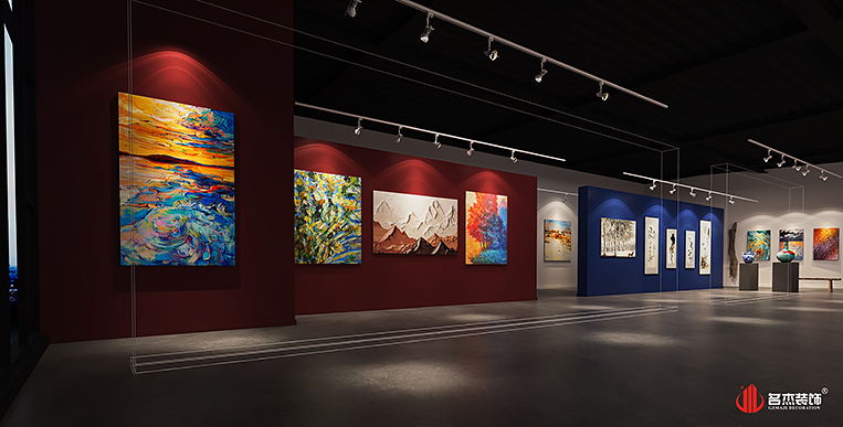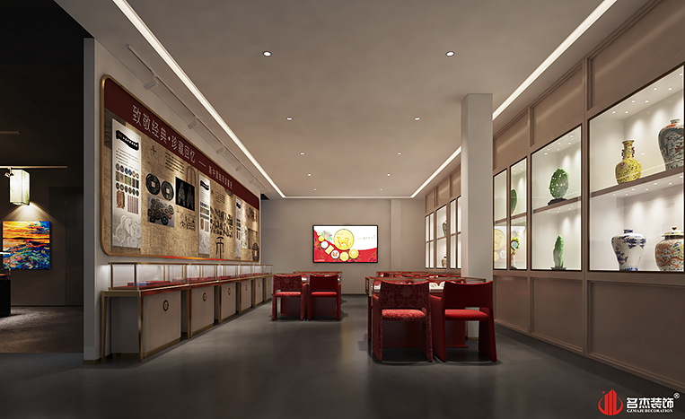 設(shè)計(jì)團(tuán)隊(duì)在前臺區(qū)域使用圓形吊頂,輔以具有線條美的燈具,配合中式傳統(tǒng)的配色來打造這個(gè)前臺區(qū)域,讓這個(gè)區(qū)域看起來帶有濃濃的新中式風(fēng)格。在展廳區(qū)域,則是使用仿燈籠造型的燈具,配合展廳的展品,來讓這個(gè)空間散發(fā)出更加濃郁的傳統(tǒng)氛圍。而在另一個(gè)展廳則是使用紅色和藍(lán)色,在視覺上形成一種強(qiáng)烈的沖擊感,讓空間看起來更加具有特色。#藝術(shù)館裝修設(shè)計(jì)#