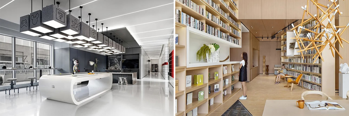 在原木色的搭配下,開放閱讀的空間內,梯形線條元素十分醒目,在書籍和文字的浸潤,達到精神上的富足。從梯形書架門洞進入和穿行,整齊羅列出各種圖書,構成一個浩瀚的書海圖鑒,公共區域的是從純白的幾何圖形開始,在設計團隊多面手法下,推演出各種方位的視窗。書吧空間打破了刻板印象中枯燥無味的路線和規則,大面積的木飾面弱化了裝飾感,反而從材質本身出發,在每個縫隙中透露出來自森林的勃勃生機。